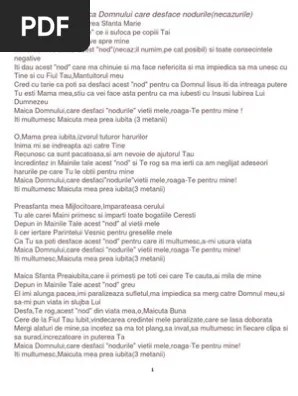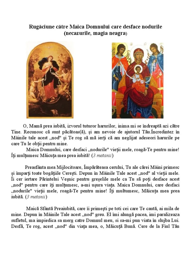 Iata rugaciunea grabnic ajutatoare pentru crestini:. Rugăciune către maica domnului o, preacurată maică a domnului, a puterilor de sus, împărăteasa cerului și a pământului, atotputernică apărătoare și tărie a noastră, … Că eu prin tine scap la bunătatea fiului tău şi prin tine, doamna mea, m … 05.02.2019 · rugăciune către maica domnului care desface nodurile (necazurile) de editor 05/02/2019. Îţi încredinţez astăzi acest nod (numim … Stăpână prea milostivă şi bună, primeşte rugăciunea mea cea ticăloasă ce se aduce ţie din gură netrebnică, deşi toate le ştii, şi mai ales neputinţa mea. 19.01.2010 · maica domnului prinde pamblica cu sfintele sale mâini, cu răbdare, desface fiecare nod, dând pamblica întinsă, netedă unui alt înger din stânga sa. Iata rugaciunea grabnic ajutatoare pentru crestini:.. Rugăciune către maica domnului o, preacurată maică a domnului, a puterilor de sus, împărăteasa cerului și a pământului, atotputernică apărătoare și tărie a noastră, …