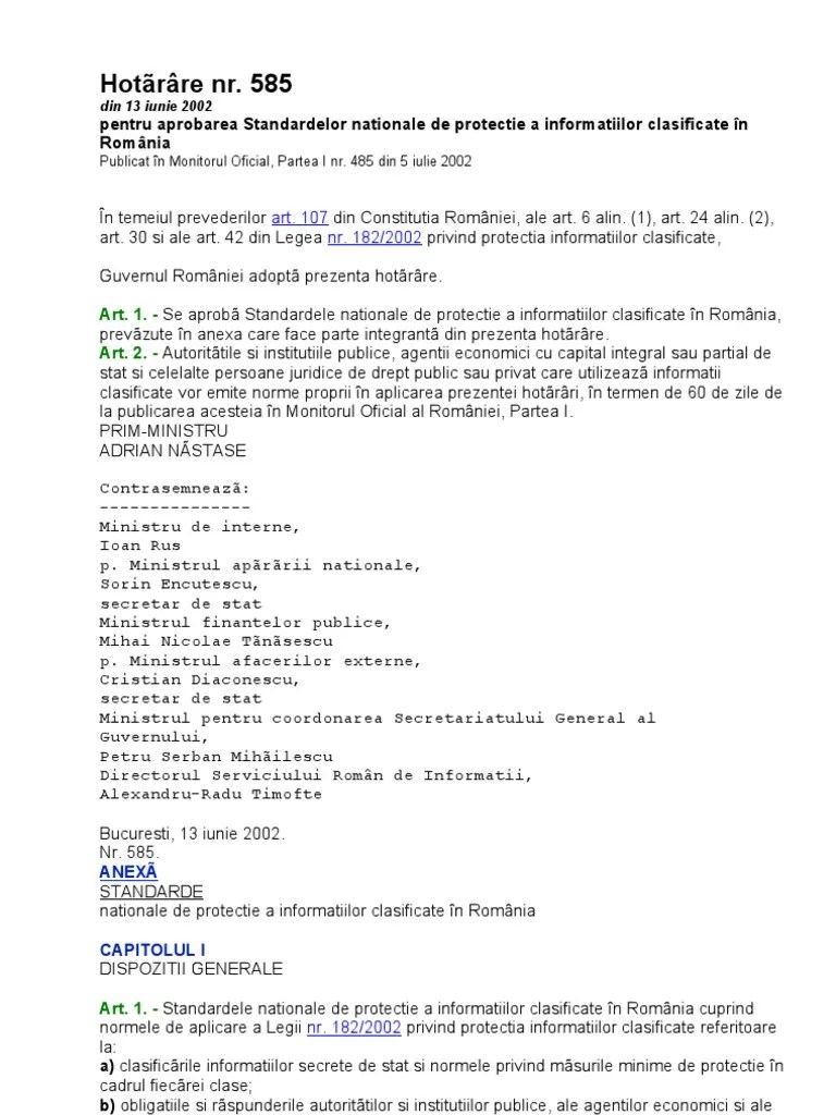 585 din 13 iunie 2002 (*actualizata*). Publicat în monitorul oficial nr. 585 din 13 iunie 2002 pentru aprobarea standardelor nationale de protectie a informatiilor clasificate in romania emitent: 2.202 din 30 noiembrie 2004 si hotarare nr.. 107 din constituția româniei, ale art.