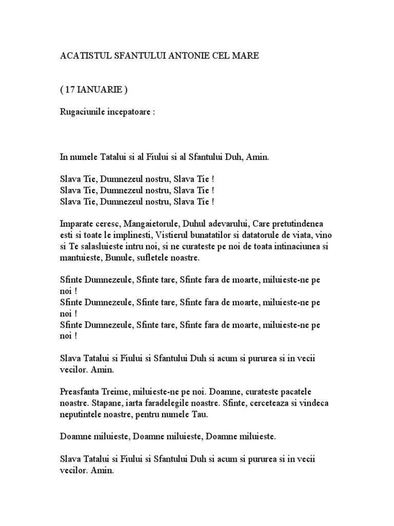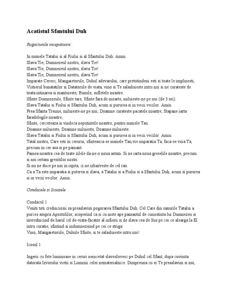 Jan 16, 2010 · rugăciunile începătoare ale acatistierului. Imparate ceresc, mangaietorule, duhul adevarului, care pretutindeni esti si toate le implinesti, vistierul bunatatilor si datatorule de viata.. Imparate ceresc, mangaietorule, duhul adevarului, care pretutindeni esti si toate le implinesti, vistierul bunatatilor si datatorule de viata.