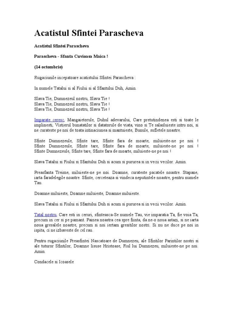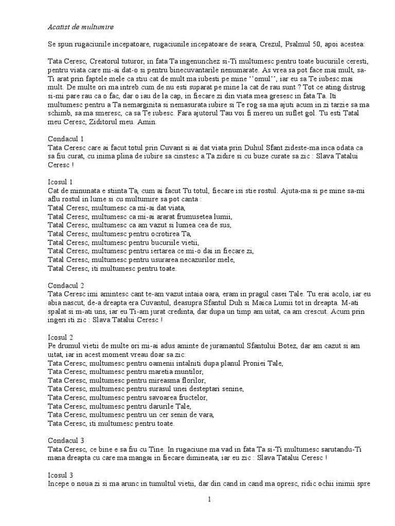 Nov 23, 2014 · rugăciunile începătoare, care se citesc înainte de orice acatist:. În numele tatălui, şi al fiului şi al sfântului duh. Imparate ceresc, mangaietorule, duhul adevarului, care pretutindeni esti si toate le implinesti, vistierul bunatatilor si datatorule de viata. În numele tatălui şi al fiului şi al sfântului duh. Jun 21, 2016 · 21 iunie 2016. Slavă ţie, dumnezeul nostru, slavă ţie! S lavă ție, dumnezeul nostru, slavă ție. Dacă o citești după rugăciunile de seară socotesc că ar fi suficient să citești... Jun 21, 2016 · 21 iunie 2016.
