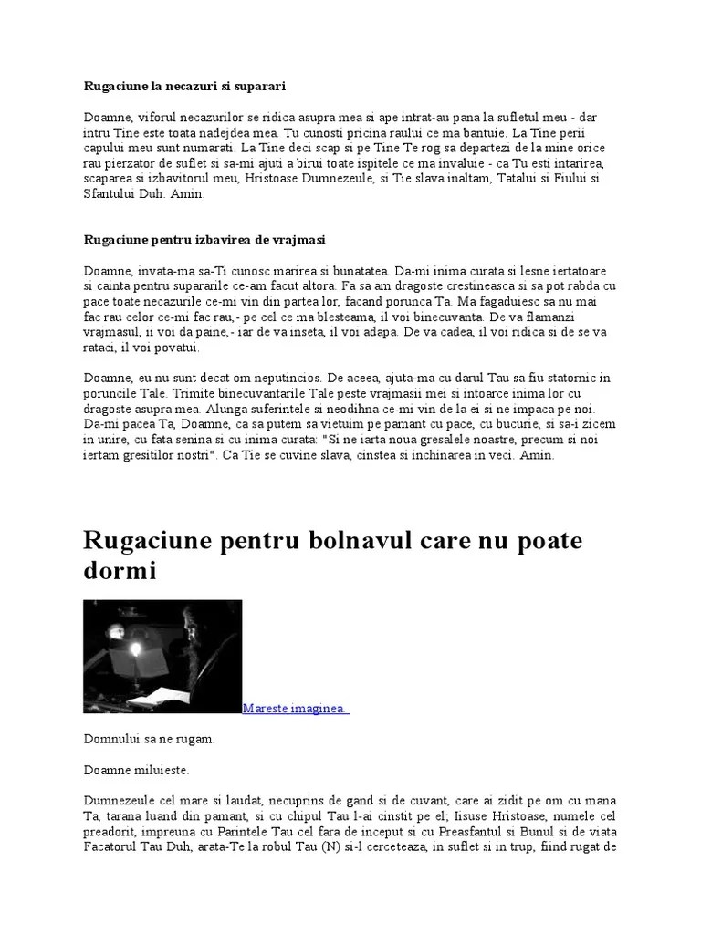 Doamne, viforul necazurilor se ridica asupra mea si intristarile chinuitoare ma ingrozesc, dar intru tine este toata nadejdea mea. La tine, deci, scap si pe tine te rog sa departezi de la mine orice rau pierzator de. Tu cunosti toata pricina raului ce ma bantuie. 21.05.2012 · rugaciune la necazuri si suparari. 30.07.2018 · about press copyright contact us creators advertise developers terms privacy policy & safety how youtube works test new features press copyright contact us creators. Tu cunosti toata pricina raului ce ma bantuie. La tine perii capului meu sunt numărați. Tu cunoști pricina răului ce mă bântuie. 25.01.2021 · mica rugaciune la necazuri si suparari. Poti face rugaciune la vreme de necaz si suparare. Valuri de patimi mă împresoară; Doamne, viforul necazurilor se ridica asupra mea si intristarile chinuitoare ma ingrozesc, dar intru tine este toata nadejdea mea.
